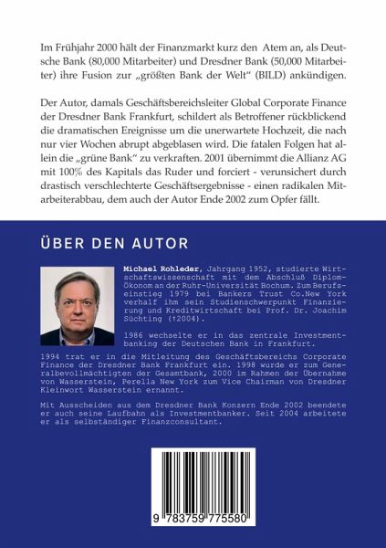 Im Frühjahr 2000 hält der Finanzmarkt kurz den Atem an, als Deutsche Bank (80,000 Mitarbeiter) und Dresdner Bank (50,000 Mitarbeiter) ihre Fusion zur "größten Bank der Welt" (BILD) ankündigen. Der Autor, damals Geschäftsbereichsleiter Corporate Finance der Dresdner Bank Frankfurt, schildert als Betroffener rückblickend die dramatischen Ereignisse um die unerwartete Hochzeit, die nach nur vier Wochen abrupt abgeblasen wird. Die fatalen Folgen hat allein die "grüne Bank" zu verkraften. 2001 übernimmt die Allianz AG mit 100% des Kapitals das Ruder und forciert - verunsichert durch drastisch verschlechterte Geschäftsergebnisse - einen radikalen Mitarbeiterabbau, dem auch der Autor Ende 2002 zum Opfer fällt.