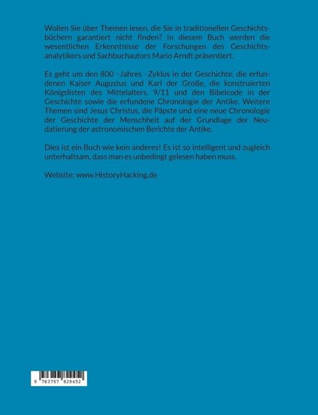 Wollen Sie über Themen lesen, die Sie in traditionellen Geschichtsbüchern garantiert nicht finden? In diesem Band werden die wesentlichen Erkenntnisse der Forschungen des Geschichtsanalytikers und Sachbuchautors Mario Arndt präsentiert. Es geht um den 800-Jahres-Zyklus in der Geschichte, die erfundenen Kaiser Augustus und Karl der Große, die konstruierten Königslisten des Mittelalters, 9/11 und den Bibelcode in der Geschichte sowie die erfundene Chronologie der Antike. Weitere Themen sind Jesus Christus, die Päpste und eine neue Chronologie der Geschichte der Menschheit auf der Grundlage der Neudatierung der astronomischen Berichte der Antike. Dies ist ein Buch wie kein anderes! Es ist so intelligent und zugleich unterhaltsam, dass man es unbedingt gelesen haben muss.Website: www.HistoryHacking.de