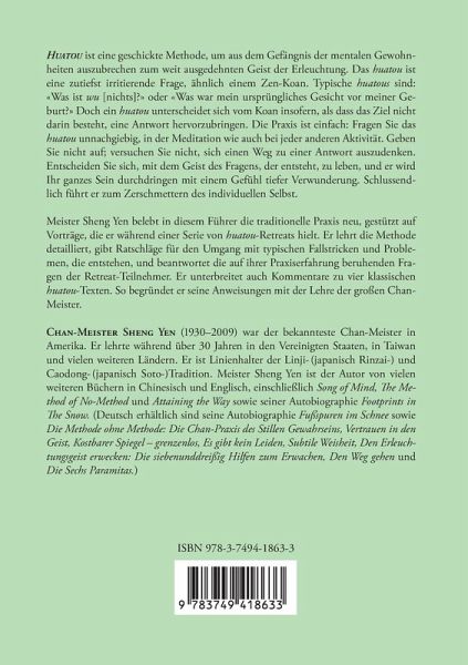 Huatou ist eine geschickte Methode, um aus dem Gefängnis der mentalen Gewohnheiten auszubrechen zum weit ausgedehnten Geist der Erleuchtung. Das huatou ist eine zutiefst irritierende Frage, ähnlich einem Zen-Koan. Typische huatous sind: «Was ist wu [nichts]?» oder «Was war mein ursprüngliches Gesicht vor meiner Geburt?» Doch ein huatou unterscheidet sich vom Koan insofern, als dass das Ziel nicht darin besteht, eine Antwort hervorzubringen. Die Praxis ist einfach: Fragen Sie das huatou unnachgiebig, in der Meditation wie auch bei jeder anderen Aktivität. Geben Sie nicht auf; versuchen Sie nicht, sich einen Weg zu einer Antwort auszudenken. Entscheiden Sie sich, mit dem Geist des Fragens, der entsteht, zu leben, und er wird Ihr ganzes Sein durchdringen mit einem Gefühl tiefer Verwunderung. Schlussendlich führt er zum Zerschmettern des individuellen Selbst.Meister Sheng Yen belebt in diesem Führer die traditionelle Praxis neu, gestützt auf Vorträge, die er während einer Serie von huatou-Retreats hielt. Er lehrt die Methode detailliert, gibt Ratschläge für den Umgang mit typischen Fallstricken und Problemen, die entstehen, und beantwortet die auf ihrer Praxiserfahrung beruhenden Fragen der Retreat-Teilnehmer. Er unterbreitet auch Kommentare zu vier klassischen huatou-Texten. So begründet er seine Anweisungen mit der Lehre der großen Chan- Meister.