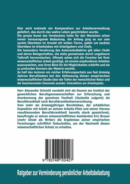 Kein Bock auf Arbeit?Hier ist sie: Die ultimative Bibel für Faulenzer!Ein Ratgeber, wie man sich im Job vor (je)der Arbeit drückt:Das Original!Zur Thematik:Die grosse Kunst des Versteckens hatte für den Menschen schon immer herausragende Bedeutung. Am Anfang ging es nur ums nackte Überleben im Urwald mit wilden Tieren, später um nacktes Überleben im Arbeitsleben mit Arbeitgebern und Chefs. Hier wird erstmals ein Kompendium zur Arbeitsvermeidung geliefert, das durch durch das wirkliche Leben geschrieben wurde. Die besondere Verehrung des Autorenkollektivs gilt allen Chefs und ihren Belegschaften, die gemeinsam stets durch ungeheure Tatkraft hervorstechen. Des Weiteren sah sich das Autorenkollektiv oftmals genötigt, als sinnlos empfundenen Arbeiten auszuweichen, was ihren Blick für die Materie schärfte. So half den Autoren ein reicher Erfahrungsschatz aus fast dreissig Jahren Berufsleben bei der Abfassung dieser wissenschaftlichen Studie über die Tiefen der menschlichen Natur und die faszinierenden Elemente der sozialen Interaktion am Arbeitsplatz.