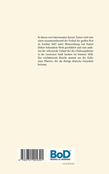 In diesen zwei interessanten kurzen Texten wird zum einen zusammenfassend der Verlauf der großen Pest zu London 1665 unter Hinzuziehung von Daniel Defoes bekanntem Werk geschildert und zum anderen der veheerende Verlauf der der Choleraepidemie in der russischen Stadt Saratow im Sommer 1830. Der erschütternde Bericht stammt aus der Feder eines Pfarrers, der die dortige deutsche Gemeinde betreute.