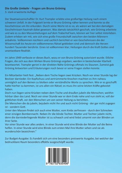 Der Staatswissenschaftler Dr. Kurt Trampler erlebte eine großartige Heilung nach einem schweren Unfall. In der Folgezeit lernte er Bruno Gröning näher kennen und konnte so die Geschehnisse um ihn erkunden. Durch seine Worte ist es so, als wären wir bei den damaligen Geschehnissen hautnah dabei gewesen. Was damals tatsächlich geschah, wie Gröning arbeitete und wie es zu den Massenheilungen auf dem Traberhof kam, können wir hier selbst miterleben. Zudem erleben wir mit, wie sich eine große Freundschaft zwischen den beiden Männern anbahnte. Vollkommen nüchtern und sachlich berichtet er von Geschehnissen, die der Wissenschaft bis heute ein vollkommenes Rätsel geblieben sind und dennoch die Herzen hunderttausender berührte. Eines ist vollkommen klar; Heilungen durch die Kraft Gottes sind unantastbare Realität.Im Jahre 1949 verfasste er dieses Buch, wozu er von Bruno Gröning autorisiert wurde. Etliche Fragen, die sich aus dem Wirken Bruno Grönings ergeben, werden in bestechender Klarheit beantwortet. Trampler geriet in der direkten Nähe Grönings oftmals ins Staunen. Zumeist gab Gröning Antworten und Erläuterungen, noch bevor er seine Fragen stellen konnte.Ein Mitarbeiter hielt fest: "Neben dem Tische liegen zwei Krücken. Noch vor einer Stunde lag der Besitzer darnieder. Ein Kopfschuss und zertrümmerte Knochen machten es ihm nahezu unmöglich, auf den Beinen zu bleiben oder verständliche Worte zu sprechen. Wie er es geschafft hatte hierher zu kommen, ist uns allen ein Rätsel; es muss ihn seine letzten Kräfte gekostet haben.Doch nun liegen seine Krücken neben dem Tische und draußen jubeln die Menschen; weithin hörbar über das Land. Noch vor einer Stunde war er dem Ende nahe und nun steht er, voll der göttlichen Kraft, vor den Menschen, um von seiner Heilung zu berichten. Die Menschen, die da jubeln, bejubeln nicht ihn und auch nicht Gröning - der gar nicht zugegen ist - sondern Gott. Unter den Massen findet sich auch eine Mutter, vom Krebs zerfressen - durch den Schrecken einer einzigen Bombennacht. Neben ihr die blinde Tochter. Mutter und Tochter jubeln nicht, denn die darniederliegende Mutter ist zu schwach und wird liebst umarmt von der Blinden an ihrer Seite.Vor einer Stunde war alles anders. In einer Stunde wird eine Blinde der Mutter auf die Beine helfen. In einer Stunde wird eine Blinde zum ersten Mal ihre Mutter sehen und sie als wunderschön bezeichnen."