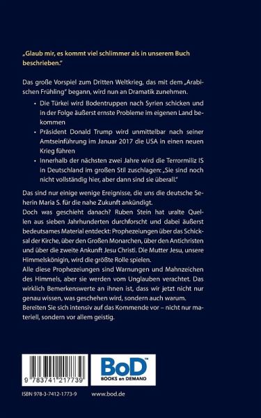 Das große Vorspiel zum Dritten Weltkrieg, das mit dem "Arabischen Frühling" begann, wird nun an Dramatik zunehmen.> Die Türkei wird Bodentruppen nach Syrien schicken und in der Folge äußerst ernste Probleme im eigenen Land bekommen.> Präsident Donald Trump wird unmittelbar nach seiner Amtseinführung im Januar 2017 die USA in einen neuen Krieg führen.> Innerhalb der nächsten zwei Jahre wird die Terrormiliz IS in Deutschland im großen Stil zuschlagen: "Sie sind noch nicht vollständig hier, aber dann sind sie überall.".Das sind nur einige wenige Ereignisse, die uns die deutsche Seherin Maria S. für die nahe Zukunft ankündigt.Doch was geschieht danach? Ruben Stein hat uralte Quellen aus sieben Jahrhunderten durchforscht und dabei äußerst bedeutsames Material entdeckt: Prophezeiungen über das Schicksal der Kirche, über den Großen Monarchen, über den Antichristen und über die zweite Ankunft Jesu Christi. Die Mutter Jesu, unsere Himmelskönigin, wird die größte Rolle spielen.Alle diese Prophezeiungen sind Warnungen und Mahnzeichen des Himmels, aber sie werden vom Unglauben verachtet. Das wirklich Bemerkenswerte an ihnen ist, dass wir jetzt nicht nur genau wissen, was geschehen wird, sondern auch warum.Bereiten Sie sich intensiv auf das Kommende vor - nicht nur materiell, sondern vor allem geistig.