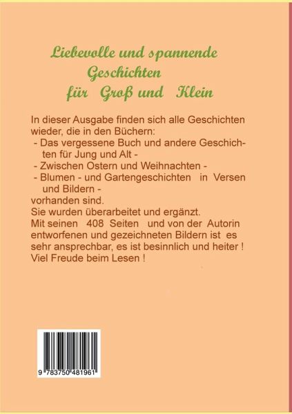 Liebevolle und spannende Geschichten für Groß und KleinIn dieser Gesamtausgabe finden sich alle Geschichten wieder, die in den Büchern: - Das vergessene Buch und andere Geschichten für Jung und Alt - - Zwischen Ostern und Weihnachten - - Blumen-und Gartengeschichten in Versen und Bildern -vorhanden sind.Die Geschichten wurden überarbeitet und ergänzt.Mit seinen 408 Seiten und von der Autorin selbst entworfenen und gezeichneten Bildern ist es sehr ansprechbar, es ist besinnlich und heiter. Viel Freude beim Lesen!