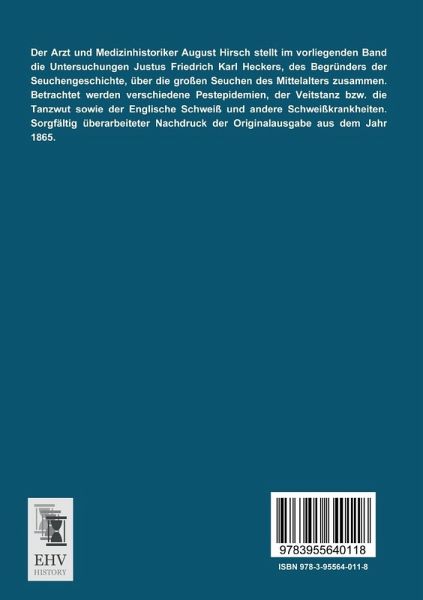 Der Arzt und Medizinhistoriker August Hirsch stellt im vorliegenden Band die Untersuchungen Justus Friedrich Karl Heckers, des Begründers der Seuchengeschichte, über die großen Seuchen des Mittelalters zusammen. Betrachtet werden verschiedene Pestepidemien, der Veitstanz bzw. die Tanzwut sowie der Englische Schweiß und andere Schweißkrankheiten. Sorgfältig überarbeiteter Nachdruck der Originalausgabe aus dem Jahr 1865.