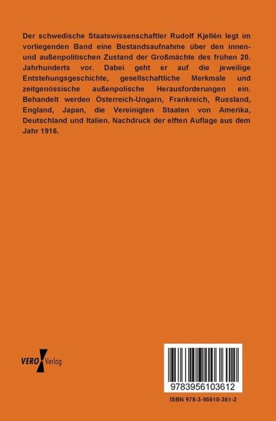 Der schwedische Staatswissenschaftler Rudolf Kjellén legt im vorliegenden Band eine Bestandsaufnahme über den innen- und außenpolitischen Zustand der Großmächte des frühen 20. Jahrhunderts vor. Dabei geht er auf die jeweilige Entstehungsgeschichte, gesellschaftliche Merkmale und zeitgenössische außenpolische Herausforderungen ein. Behandelt werden Österreich-Ungarn, Frankreich, Russland, England, Japan, die Vereinigten Staaten von Amerika, Deutschland und Italien. Nachdruck der elften Auflage aus dem Jahr 1916.
