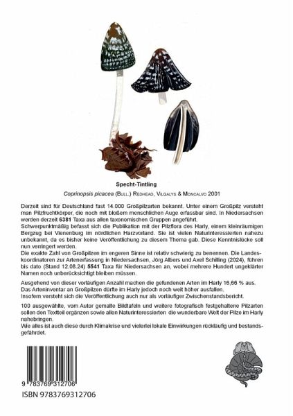 Derzeit sind für Deutschland fast 14.000 Großpilzarten bekannt. Unter einem Großpilz versteht man Pilzfruchtkörper, die noch mit bloßem menschlichen Auge erfassbar sind. In Niedersachsen werden derzeit 6381 Taxa aus allen taxonomischen Gruppen angeführt. Schwerpunktmäßig befasst sich die Publikation mit der Pilzflora des Harly, einem kleinräumigen Bergzug bei Vienenburg im nördlichen Harzvorland. Sie ist vielen Naturinteressierten nahezu unbekannt, da es bisher keine Veröffentlichung zu diesem Thema gab. Diese Kenntnislücke soll nun verringert werden. Die exakte Zahl von Großpilzen im engeren Sinne ist relativ schwierig zu benennen. Die Landes-koordinatoren zur Artenerfassung in Niedersachsen, Jörg Albers und Axel Schilling (2024), führen bis dato (Stand 12.08.24) 5541 Taxa für Niedersachsen an, wobei mehrere Hundert ungeklärter Namen noch unberücksichtigt bleiben müssen. Ausgehend von dieser vorläufigen Anzahl machen die gefundenen Arten im Harly 16,66 % aus. Das Arteninventar an Großpilzen dürfte im Harly jedoch noch weit höher ausfallen. Insofern versteht sich die Veröffentlichung auch nur als vorläufiger Zwischenstandsbericht. 100 ausgewählte, vom Autor gemalte Bildtafeln und weitere fotografisch festgehaltene Pilzarten sollen den Textteil ergänzen sowie allen Naturinteressierten die wunderbare Welt der Pilze im Harly nahebringen. Wie alles ist auch diese durch Klimakrise und vielerlei lokale Einwirkungen rückläufig und bestandsgefährdet.