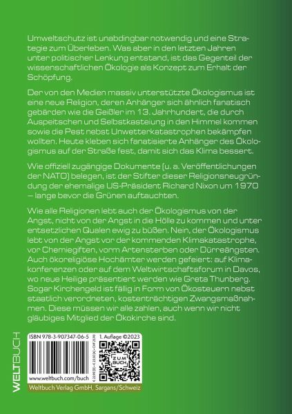 Umweltschutz ist unabdingbar notwendig und eine Strategie zum Überleben. Was aber in den letzten Jahren unter politischer Lenkung entstand, ist das Gegenteil der wissenschaftlichen Ökologie als Konzept zum Erhalt der Schöpfung.Der von den Medien massiv unterstützte Ökologismus ist eine neue Religion, deren Anhänger sich ähnlich fanatisch gebärden wie die Geißler im 13. Jahrhundert, die durch Auspeitschen und Selbstkasteiung in den Himmel kommen sowie die Pest nebst Unwetterkatastrophen bekämpfen wollten. Heute kleben sich fanatisierte Anhänger des Ökologismus auf der Straße fest, damit sich das Klima bessert.Wie offiziell zugängige Dokumente (u. a. Veröffentlichungen der NATO) belegen, ist der Stifter dieser Religionsneugründung der ehemalige US-Präsident Richard Nixon um 1970 - lange bevor die Grünen auftauchten. Wie alle Religionen lebt auch der Ökologismus von der Angst, nicht von der Angst in die Hölle zu kommen und unter entsetzlichen Qualen ewig zu büßen. Nein, der Ökologismus lebt von der Angst vor der kommenden Klimakatastrophe, vor Chemiegiften, vorm Artensterben oder Dürreängsten. Auch ökoreligiöse Hochämter werden gefeiert: auf Klimakonferenzen oder auf dem Weltwirtschaftsforum in Davos, wo neue Heilige präsentiert werden wie Greta Thunberg. Sogar Kirchengeld ist fällig in Form von Ökosteuern nebst staatlich verordneten, kostenträchtigen Zwangsmaßnahmen. Diese müssen wir alle zahlen, auch wenn wir nicht gläubiges Mitglied der Ökokirche sind.