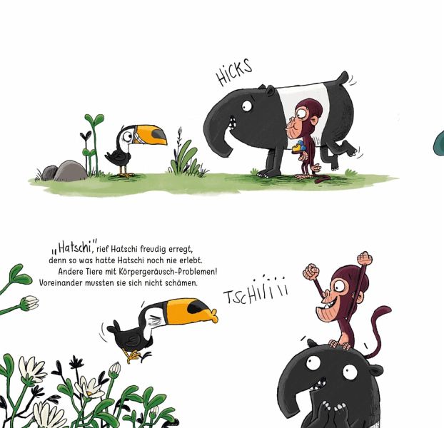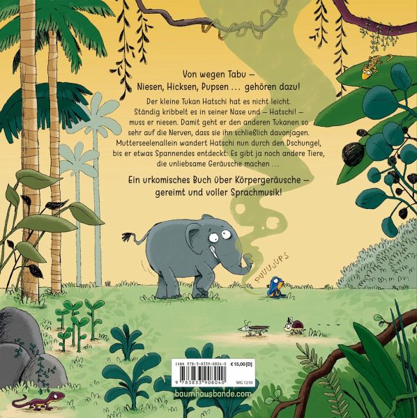 Von wegen Tabu - Körpergeräusche wie Hicksen, Niesen, Rülpsen, Pupsen oder Grummeln gehören einfach zum Leben dazu!Der kleine Tukan Hatschi hat es nicht leicht, denn ständig kribbelt es in seiner Nase. Ob er nun will oder nicht - Hatschi! - muss er niesen. Damit vertreibt er nicht nur jeden Leckerbissen, sondern geht den anderen Tukanen so gehörig auf die Nerven, dass die ihn schließlich wegschicken. Doch auf seinem Weg durch den Dschungel macht Hatschi eine spannende Entdeckung: Es gibt ja noch andere Tiere, die unliebsame Geräusche machen. Die Schluckauf haben, deren Magen grummelt und bei denen seltsame Winde wehen ... Der kleine Tukan ist begeistert. Gemeinsam mit den neuen Freunden klingt sein Niesen plötzlich wie Musik: »Pups, Hatschi, Rülps, Grummel, Hicks, Grummel, Hatschi!« Ein Bilderbuch, das zum Mitsprechen einlädt und humorvoll die Sprachentwicklung und das Rhythmusgefühl von Kindern fördertBietet einen schönen Anlass, um über menschliche Körpergeräusche zu sprechen.Mit viel Charme und Witz illustriert von Nikolai Renger
