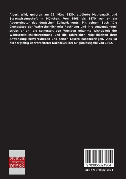 Albert Wild, geboren am 26. März 1830, studierte Mathematik und Staatswissenschaft in München. Von 1868 bis 1870 war er ein Abgeordneter des deutschen Zollparlaments. Mit seinem Buch \"Die Grundsätze der Wahrscheinlichkeits-Rechnung und ihre Anwendungen\" strebt er an, die seinerzeit von Wenigen erkannte Wichtigkeit der Wahrscheinlichkeitsrechnung und die zahlreichen Möglichkeiten ihrer Anwendung hervorzuheben und seinen Lesern nahezubringen. Dies ist ein sorgfältig überarbeiteter Nachdruck der Originalausgabe von 1862.