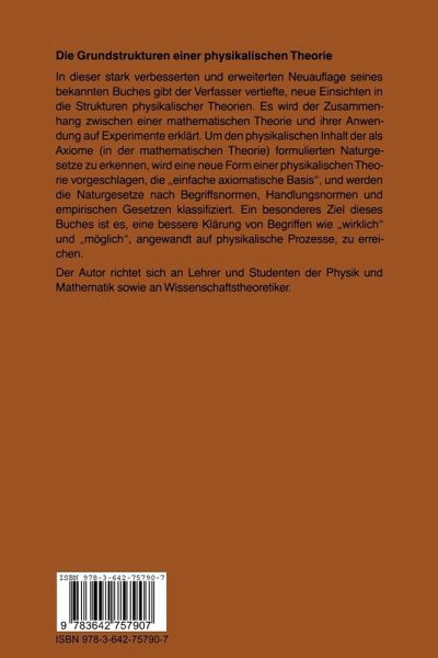 In dieser stark verbesserten und erweiterten Neuauflage seines bekannten Buches bietet der Verfasser vertiefte, neue Einsichten in die Strukturen physikalischer Theorien. Er erklärt den Zusammenhang zwischen einer mathematischen Theorie und ihrer Anwendung auf Experimente. Um den physikalischen Inhalt der in der mathematischen Theorie als Axiome formulierten Naturgesetze zu erkennen, wird eine neue Form einer physikalischen Theorie vorgeschlagen, die "einfache axiomatische Basis", und die Naturgesetze werden nach Begriffsnormen, Handlungsnormen und empirischen Gesetzen klassifiziert. Ein besonderes Ziel dieses Buches ist es, eine bessere Klärung von Begriffen wie "wirklich" und "möglich", angewandt auf physikalische Prozesse, zu erreichen. Der Autor richtet sich an Dozenten und Studenten der Physik und Mathematik sowie an Wissenschaftstheore- tiker.