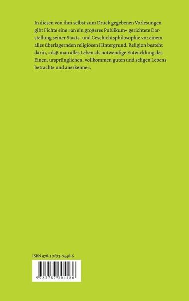 In diesen von ihm selbst zum Druck gegebenen Vorlesungen gibt Fichte eine "an ein größeres Publikum" gerichtete Darstellung seiner Staats- und Geschichtsphilosophie vor einem alles überlagernden religiösen Hintergrund. Religion besteht darin, "dass man alles Leben als notwendige Entwicklung des Einen, ursprünglichen, vollkommen guten und seligen Lebens betrachte und anerkenne".