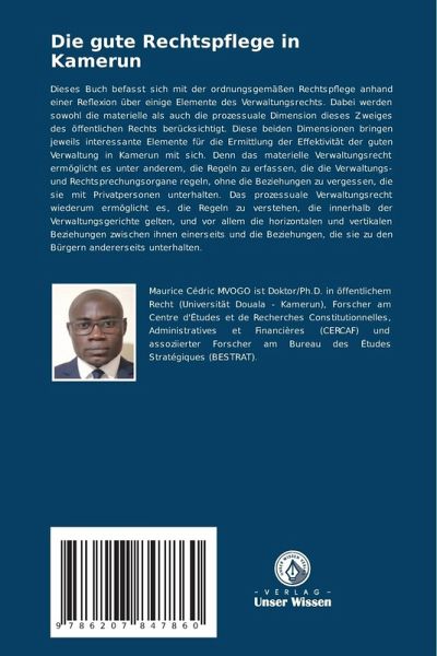 Dieses Buch befasst sich mit der ordnungsgemäßen Rechtspflege anhand einer Reflexion über einige Elemente des Verwaltungsrechts. Dabei werden sowohl die materielle als auch die prozessuale Dimension dieses Zweiges des öffentlichen Rechts berücksichtigt. Diese beiden Dimensionen bringen jeweils interessante Elemente für die Ermittlung der Effektivität der guten Verwaltung in Kamerun mit sich. Denn das materielle Verwaltungsrecht ermöglicht es unter anderem, die Regeln zu erfassen, die die Verwaltungs- und Rechtsprechungsorgane regeln, ohne die Beziehungen zu vergessen, die sie mit Privatpersonen unterhalten. Das prozessuale Verwaltungsrecht wiederum ermöglicht es, die Regeln zu verstehen, die innerhalb der Verwaltungsgerichte gelten, und vor allem die horizontalen und vertikalen Beziehungen zwischen ihnen einerseits und die Beziehungen, die sie zu den Bürgern andererseits unterhalten.