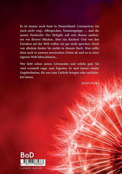 Es ist immer noch bunt in Deutschland: Coronavirus (ist noch nicht weg), Affenpocken, Tomatengrippe ... und die neuste Nachricht: Der Hefepilz soll sich ebenso ausbreitenwie diverse Mücken. Aber nix Kuchen! Und von den Unruhen auf der Welt wollen wir gar nicht sprechen. Doch von alledem finden Sie nichts in diesem Buch. Man sollte eben auch in unseren unwirschen Zeiten ab und zu in einer eigenen Welt leben können...Wer liebt schon seinen Löwenzahn und welche gute Tat wird eventuell sogar zum Eigentor. Es sind immer wieder Gegebenheiten, die uns zum Lächeln bringen oder nachdenken lassen.