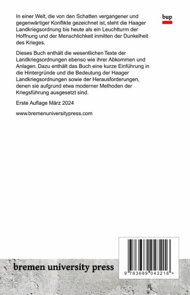 In einer Welt, die von den Schatten vergangener und gegenwärtiger Konflikte gezeichnet ist, steht die Haager Landkriegsordnung bis heute als ein Leuchtturm der Hoffnung und der Menschlichkeit inmitten der Dunkelheit des Krieges. Dieses Buch enthält die wesentlichen Texte der Landkriegsordnungen ebenso wie ihrer Abkommen und Anlagen. Dazu enthält das Buch eine kurze Einführung in die Hintergründe und die Bedeutung der Haager Landkriegsordnungen sowie der Herausforderungen, denen sie aufgrund etwa moderner Methoden der Kriegsführung ausgesetzt sind.
