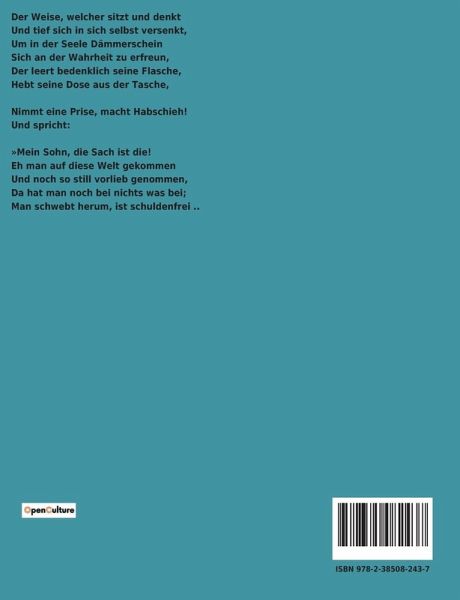 Der Weise, welcher sitzt und denkt Und tief sich in sich selbst versenkt, Um in der Seele Dämmerschein Sich an der Wahrheit zu erfreun, Der leert bedenklich seine Flasche, Hebt seine Dose aus der Tasche, Nimmt eine Prise, macht Habschieh! Und spricht: »Mein Sohn, die Sach ist die! Eh man auf diese Welt gekommen Und noch so still vorlieb genommen, Da hat man noch bei nichts was bei; Man schwebt herum, ist schuldenfrei ..