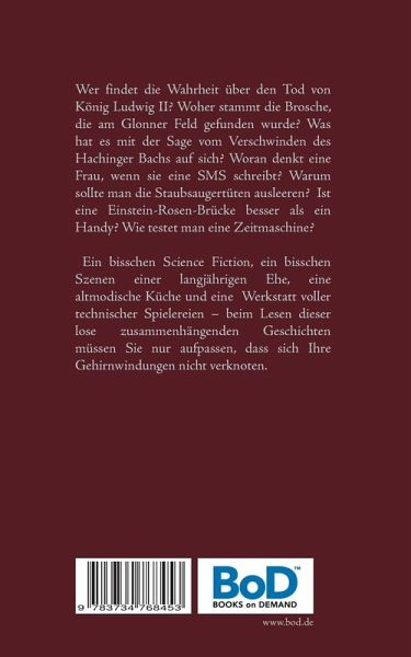 Wer findet die Wahrheit über den Tod von König Ludwig II? Woher stammt die Brosche, die am Glonner Feld gefunden wurde? Was hat es mit der Sage vom Verschwinden des Hachinger Bachs auf sich? Woran denkt eine Frau, wenn sie eine SMS schreibt? Warum sollte man die Staubsaugertüten ausleeren? Ist eine Einstein-Rosen-Brücke besser als ein Handy? Wie testet man eine Zeitmaschine? Ein bisschen Science Fiction, ein bisschen Szenen einer langjährigen Ehe, eine altmodische Küche und eine Werkstatt voller technischer Spielereien - beim Lesen dieser lose zusammenhängenden Geschichten müssen Sie nur aufpassen, dass sich Ihre Gehirnwindungen nicht verknoten.