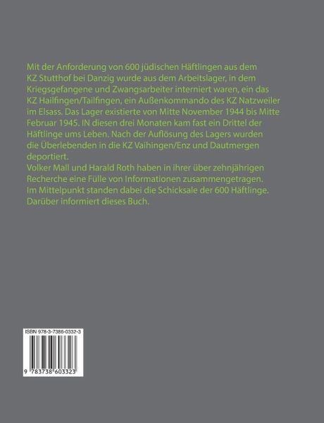 Mit der Anforderung von 600 jüdischen Häftlingen aus dem KZ Stutthof bei Danzig wurde aus dem Arbeitslager, in dem Kriegsgefangene und Zwangsarbeiter interniert waren, ein das KZ Hailfingen/Tailfingen, ein Außenkommando des KZ Natzweiler im Elsass. Das Lager existierte von Mitte November 1944 bis Mitte Februar 1945. IN diesen drei Monaten kam fast ein Drittel der Häftlinge ums Leben. Nach der Auflösung des Lagers wurden die Überlebenden in die KZ Vaihingen/Enz und Dautmergen deportiert.Volker Mall und Harald Roth haben in ihrer über zehnjährigen Recherche eine Fülle von Informationen zusammengetragen. Im Mittelpunkt standen dabei die Schicksale der 600 Häftlinge. Darüber informiert dieses Buch.