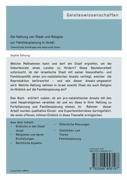Welche Haltung nehmen in Israel sowohl Staat als auch Religion im Hinblick auf die Familienplanung ein? Diese Arbeit untersucht, ob der israelische Staat mit seiner Gesundheits- und Familienpolitik einen pro-natalistischen Ansatz verfolgt, welcher eine menschliche Reproduktion befürwortet - und wie dieser Ansatz umgesetzt wird. Weiterhin wird erörtert, ob ein pro-natalistischer Ansatz mit den zwei Hauptreligionen vereinbar ist. Auch sollen die Familie und die Familienplanung sowie die Geburtenraten näher betrachtet werden. Dabei wird besonders auf die Religionen und deren Haltung zur Fortpflanzung eingegangen.Im Rahmen dieser Arbeit wurden qualitative Einzel- und Experteninterviews durchgeführt. Somit wird ein möglichst offener erster Einblick in die Thematik ermöglicht, welcher einer ersten Hypothesengenerierung dient. Da es sich bei der Forschungsfrage um ein individuelles und sensibles Thema handelt, wurden die Interviews per E-Mail mit Hilfe von leitfadengestützten und strukturierenden Interviews durchgeführt. Ergänzend werden Gedächtnisprotokolle der Autorin hinzugefügt und amtliche Statistiken ausgewertet.Aus dem Inhalt:Einblicke in den Staat Israel,Religionen und deren Einstellungen zum Thema Familienplanung,Rechtliche Aspekte in Hinsicht auf Familienplanung,Statistiken über Familienplanung,Öffentliche Meinungen zum Thema.