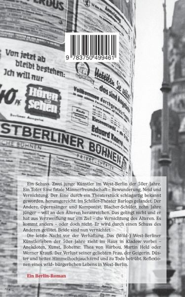 Ein Schuss. Zwei junge Künstler im West-Berlin der 50er Jahre. Ein Toter. Eine fatale Männerfreundschaft - Bewunderung, Neid und Vernichtung. Der Eine durch ein Theaterstück schlagartig bekannt geworden, herumgereicht. Im Schiller-Theater Barlogs gelandet. Der Andere, Opernsänger und Komponist, Blacher-Schüler, zehn Jahre jünger - will an den Älteren heranreichen. Das gelingt nicht und er hat aus Verzweiflung nur ein Ziel - die Vernichtung des Älteren. Es kommt anders - oder doch nicht. Er wird durch einen Schuß des Anderen getötet. Beide sind nun vernichtet.Die letzte Nacht vor der Verhaftung. Das (Wild-) West-Berliner Künstlerleben der 50er Jahre zieht im Haus in Kladow vorbei - Anekdoten, Kunst, Boheme: Thea von Harbou, Martin Held oder Werner Krauß. Der Verlust seiner geliebten Frau, der Geigerin. Düster und heiter. Himmelhochjauchzend und zu Tode betrübt.Reflexionen eines wild-bürgerlichen Lebens in West-Berlin.Ein Berlin-Roman. Eine authentische Kulisse, in der das Spiel spielt. Mit autobiographischen Zügen.
