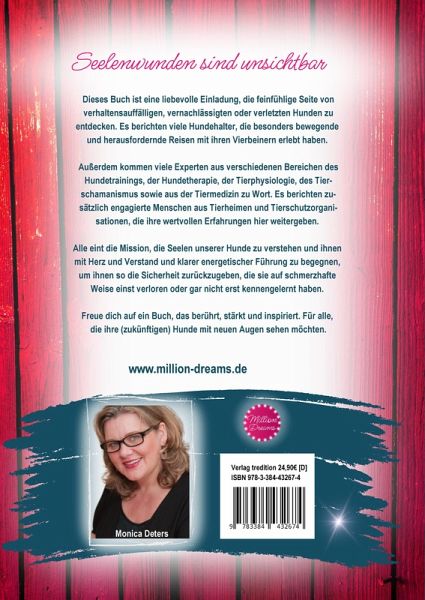 Seelenwunden sind unsichtbar!Dieses Buch ist eine liebevolle Einladung, die feinfühlige Seite von verhaltensauffälligen, vernachlässigten oder verletzten Hunden zu entdecken. Es berichten viele Hundehalter, die besonders bewegende und herausfordernde Reisen mit ihren Vierbeinern erlebt haben. Außerdem kommen viele Experten aus verschiedenen Bereichen des Hundetrainings, der Hundetherapie, der Tierphysiologie, des Tier-schamanismus sowie aus der Tiermedizin zu Wort. Es berichten zusätzlich engagierte Menschen aus Tierheimen und Tierschutzorganisationen, die ihre wertvollen Erfahrungen hier weitergeben. Alle eint die Mission, die Seelen unserer Hunde zu verstehen und ihnen mit Herz und Verstand und klarer energetischer Führung zu begegnen, um ihnen so die Sicherheit zurückzugeben, die sie auf schmerzhafte Weise einst verloren oder gar nicht erst kennengelernt haben. Freue dich auf ein Buch, das berührt, stärkt und inspiriert. Für alle, die ihre (zukünftigen) Hunde mit neuen Augen sehen möchten.