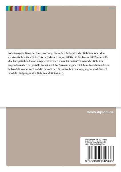 Die Arbeit behandelt die Richtlinie über den elektronischen Geschäftsverkehr (erlassen im Juli 2000), die bis Januar 2002 innerhalb der Europäischen Union umgesetzt werden muss.