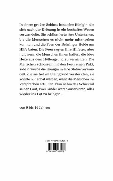 In einem großen Schloss lebte eine Königin, die sich nach der Krönung in ein boshaftes Wesen verwandelte. Sie schikanierte ihre Untertanen, bis die Menschen es nicht mehr mitansehen konnten und die Feen der Behringer Heide um Hilfe baten. Die Feen sagten ihre Hilfe zu, aber nur, wenn die Menschen ihnen halfen, die böse Hexe aus dem Höllengrund zu vernichten. Die Menschen schlossen mit den Feen einen Pakt, sobald wurde die Königin in eine Statue verwandelt, die sie tief im Steingrund versteckten, sie konnte nur erlöst werden, wenn die Menschen ihr Versprechen erfüllten. Nun nahm das Schicksal seinen Lauf, zwei Kinder waren auserkoren, alles wieder ins Lot zu bringen ...