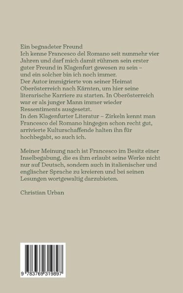 Francesco del Romano, geboren 1984 in Steyr, Österreich, war und ist ein Liebhaber der italienischen Literatur. Diese hat er sich, teils an verschiedenen Universitäten, jedoch größtenteils als Autodidakt in jahrelangem Studium angeeignet. Dante, Boccaccio, Petrarca, Leopardi, Pavese. Nur einige große illustre Namen der italienischen Literaturgeschichte bereiteten seinem Schreiben maßgebliche Inspiration. Er schreibt in drei Sprachen: Deutsch, Italienisch und Englisch. Genau genommen durchwegs eine Seltenheit für einen Schriftsteller. Seit nunmehr über vier Jahren hat der Lyriker seinen Lebensmittelpunkt von Linz nach Klagenfurt verlegt. Aus vergangener Lethargie und Depression sozusagen wieder auferstanden, schreibt und wirkt er fleißig bei BUCH13 (der größten Kärntner Literaturbühne), wo er unter anderem auch schon den einen oder anderen Auftritt mit Erfolg bestritten. Bei Books on Demand sind bisher von Francesco del Romano erschienen: Der Blumenwolf 2015 Der glücklose Schlafwandler 2016 Gedeihen und Verblühen 2018 Vor allen Dingen als Lyriker bekannt, versucht er sich mit Die Helden der letzten Tage an der Erzählkunst.