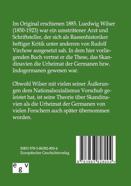 Im Original erschienen 1885. Luedwig Wilser (1850-1923) war ein umstrittener Arzt und Schriftsteller, der sich als Rassenhistoriker heftiger Kritik unter anderem von Rudolf Virchow ausgesetzt sah. In dem hier vorliegenden Buch vertrat er die These, das Skandinavien die Urheimat der Germanen bzw. Indogermanen gewesen war.
