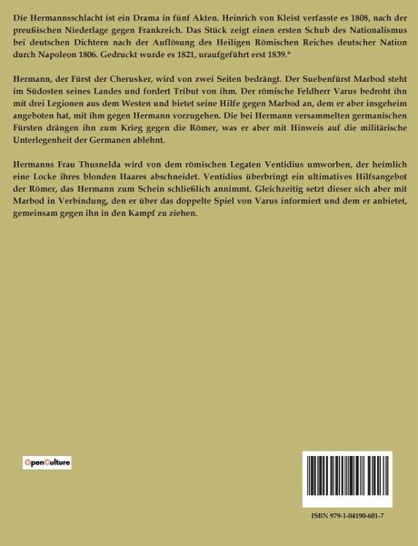 Die Hermannsschlacht ist ein Drama in fünf Akten. Heinrich von Kleist verfasste es 1808, nach der preußischen Niederlage gegen Frankreich. Das Stück zeigt einen ersten Schub des Nationalismus bei deutschen Dichtern nach der Auflösung des Heiligen Römischen Reiches deutscher Nation durch Napoleon 1806. Gedruckt wurde es 1821, uraufgeführt erst 1839.* Hermann, der Fürst der Cherusker, wird von zwei Seiten bedrängt. Der Suebenfürst Marbod steht im Südosten seines Landes und fordert Tribut von ihm. Der römische Feldherr Varus bedroht ihn mit drei Legionen aus dem Westen und bietet seine Hilfe gegen Marbod an, dem er aber insgeheim angeboten hat, mit ihm gegen Hermann vorzugehen. Die bei Hermann versammelten germanischen Fürsten drängen ihn zum Krieg gegen die Römer, was er aber mit Hinweis auf die militärische Unterlegenheit der Germanen ablehnt. Hermanns Frau Thusnelda wird von dem römischen Legaten Ventidius umworben, der heimlich eine Locke ihres blonden Haares abschneidet. Ventidius überbringt ein ultimatives Hilfsangebot der Römer, das Hermann zum Schein schließlich annimmt. Gleichzeitig setzt dieser sich aber mit Marbod in Verbindung, den er über das doppelte Spiel von Varus informiert und dem er anbietet, gemeinsam gegen ihn in den Kampf zu ziehen.