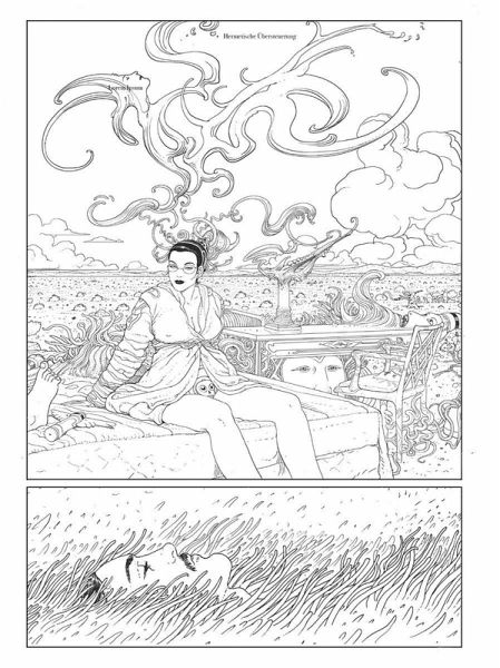 Mit diesem Band erscheint endlich bislang unveröffentlichtes Material von Moebius in deutscher Sprache! Major Grubert reist durch eine extraterrestrische Wüste und sucht Madame Van Peebles, eine geheimnisvolle Frau, die ihn durch sein Unterbewusstsein führt: Eine Tour de Force voll wilder Verwandlungen und trippigem Surrealismus! Moebius, der französische Comiczeichner und Schriftsteller, gilt als großer Visionär, der mit seinen Werken die Science-Fiction-Kunst, das Comic-Medium und die visuelle Kultur nachhaltig geprägt hat. In seinen Werken entwirft er surreale, detailverliebte Welten, in denen utopische Architekturen, futuristische Metropolen, endlose Wüsten und schamanistische Reisen miteinander verschmelzen. Die zwischen 2006 und 2008 entstandenen Seiten sind voll von fantastischen Bildern und eröffnen ein Universum, das Moebius mit seinem charakteristisch präzisen Federstrich zum Leben erweckt. Wunderschön gedruckt in sattem Schwarz auf dickem Papier.