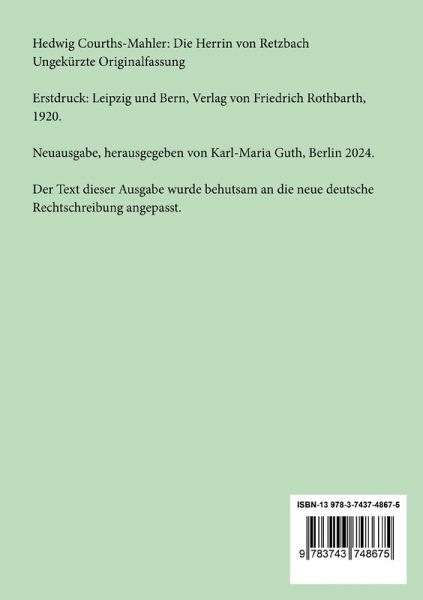Hedwig Courths-Mahler: Die Herrin von Retzbach. Ungekürzte Originalfassung Erstdruck: Leipzig und Bern, Verlag von Friedrich Rothbarth, 1920. Neuausgabe, herausgegeben von Karl-Maria Guth, Berlin 2024. Der Text dieser Ausgabe wurde behutsam an die neue deutsche Rechtschreibung angepasst. Gesetzt aus der Minion Pro, 11 pt. Henricus - Edition Deutsche Klassik GmbH