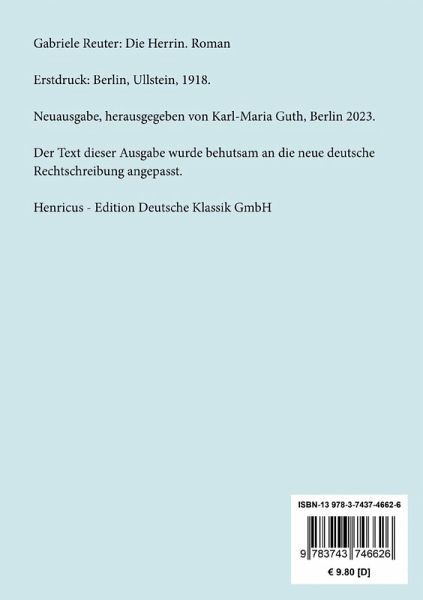 Gabriele Reuter: Die Herrin. RomanErstdruck: Berlin, Ullstein, 1918.Neuausgabe, herausgegeben von Karl-Maria Guth, Berlin 2023.Der Text dieser Ausgabe wurde behutsam an die neue deutsche Rechtschreibung angepasst.Gesetzt aus der Minion Pro, 11 pt.Die Sammlung Hofenberg erscheint im Verlag Henricus - Edition Deutsche Klassik GmbH, Berlin