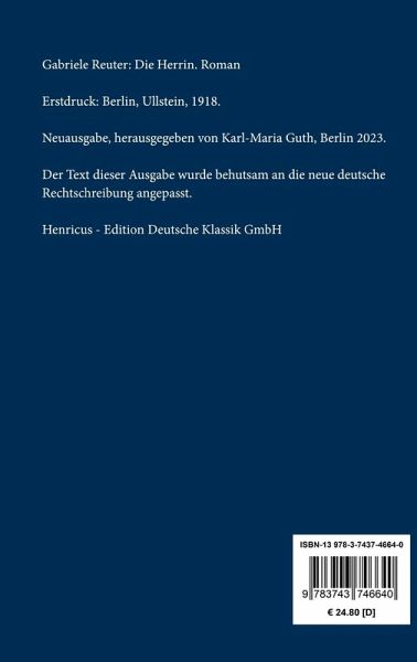 Gabriele Reuter: Die Herrin. RomanErstdruck: Berlin, Ullstein, 1918.Neuausgabe, herausgegeben von Karl-Maria Guth, Berlin 2023.Der Text dieser Ausgabe wurde behutsam an die neue deutsche Rechtschreibung angepasst.Gesetzt aus der Minion Pro, 11 pt.Die Sammlung Hofenberg erscheint im Verlag Henricus - Edition Deutsche Klassik GmbH, Berlin