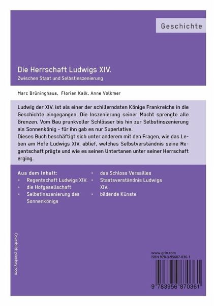 Fachbuch aus dem Jahr 2013 im Fachbereich Geschichte Europa - and. Länder - Neueste Geschichte, Europäische Einigung, , Sprache: Deutsch, Abstract: Ludwig der XIV. ist als einer der schillerndsten Könige Frankreichs in die Geschichte eingegangen. Die Inszenierung seiner Macht sprengte alle Grenzen. Vom Bau prunkvoller Schlösser bis hin zur Selbstinszenierung als Sonnenkönig - für ihn gab es nur Superlative.Dieses Buch beschäftigt sich unter anderem mit den Fragen, wie das Leben am Hofe Ludwigs XIV. ablief, welches Selbstverständnis seine Regentschaft prägte und wie es seinen Untertanen unter seiner Herrschaft erging.Aus dem Inhalt: Regentschaft Ludwigs XIV., die Hofgesellschaft, Selbstinszenierung des Sonnenkönigs, das Schloss Versailles, Staatsverständnis Ludwigs XIV., bildende Künste.