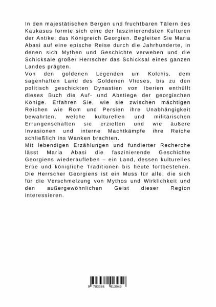In den majestätischen Bergen und fruchtbaren Tälern des Kaukasus formte sich eine der faszinierendsten Kulturen der Antike: das Königreich Georgien. Begleiten Sie Maria Abasi auf eine epische Reise durch die Jahrhunderte, in denen sich Mythen und Geschichte verweben und die Schicksale großer Herrscher das Schicksal eines ganzen Landes prägten.Von den goldenen Legenden um Kolchis, dem sagenhaften Land des Goldenen Vlieses, bis zu den politisch geschickten Dynastien von Iberien enthüllt dieses Buch die Auf- und Abstiege der georgischen Könige. Erfahren Sie, wie sie zwischen mächtigen Reichen wie Rom und Persien ihre Unabhängigkeit bewahrten, welche kulturellen und militärischen Errungenschaften sie erzielten und wie äußere Invasionen und interne Machtkämpfe ihre Reiche schließlich ins Wanken brachten.Mit lebendigen Erzählungen und fundierter Recherche lässt Maria Abasi die faszinierende Geschichte Georgiens wiederaufleben - ein Land, dessen kulturelles Erbe und königliche Traditionen bis heute fortbestehen. Die Herrscher Georgiens ist ein Muss für alle, die sich für die Verschmelzung von Mythos und Wirklichkeit und den außergewöhnlichen Geist dieser Region interessieren.