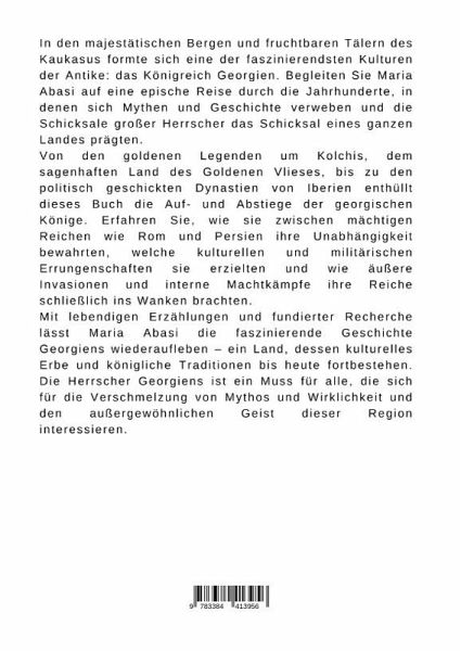 In den majestätischen Bergen und fruchtbaren Tälern des Kaukasus formte sich eine der faszinierendsten Kulturen der Antike: das Königreich Georgien. Begleiten Sie Maria Abasi auf eine epische Reise durch die Jahrhunderte, in denen sich Mythen und Geschichte verweben und die Schicksale großer Herrscher das Schicksal eines ganzen Landes prägten.Von den goldenen Legenden um Kolchis, dem sagenhaften Land des Goldenen Vlieses, bis zu den politisch geschickten Dynastien von Iberien enthüllt dieses Buch die Auf- und Abstiege der georgischen Könige. Erfahren Sie, wie sie zwischen mächtigen Reichen wie Rom und Persien ihre Unabhängigkeit bewahrten, welche kulturellen und militärischen Errungenschaften sie erzielten und wie äußere Invasionen und interne Machtkämpfe ihre Reiche schließlich ins Wanken brachten.Mit lebendigen Erzählungen und fundierter Recherche lässt Maria Abasi die faszinierende Geschichte Georgiens wiederaufleben - ein Land, dessen kulturelles Erbe und königliche Traditionen bis heute fortbestehen. Die Herrscher Georgiens ist ein Muss für alle, die sich für die Verschmelzung von Mythos und Wirklichkeit und den außergewöhnlichen Geist dieser Region interessieren.