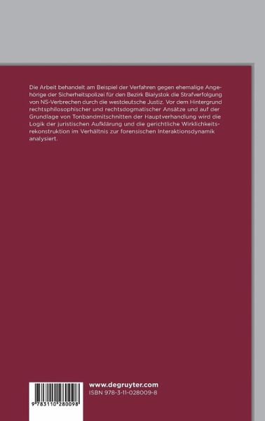 Die Arbeit behandelt am Beispiel der Verfahren gegen ehemalige Angehörige der Sicherheitspolizei für den Bezirk Bialystok die Strafverfolgung von NS-Verbrechen durch die westdeutsche Justiz. Die Organisation der Deportationen im Jahr 1943 aus den jüdischen Ghettos des deutsch besetzten nordostpolnischen Bezirks in die Vernichtungslager Auschwitz und Treblinka war Gegenstand eines Strafprozesses vor dem Schwurgericht in Bielefeld. Die Angeklagten wurden am 14. April 1967 wegen ihrer Beteiligung an den Deportationen aus Bialystok und Grodno der "gemeinschaftlichen Beihilfe zum gemeinschaftlichen Mord" an mehreren tausend Juden schuldig gesprochen. Der ehemalige Kommandeur der Sicherheitspolizei und ein Abteilungsleiter seiner Dienststelle wurden in einem weiteren Fall wegen Beihilfe zum Mord verurteilt. Das Gericht erbrachte den Nachweis, dass sie im Februar 1943 die Erschießung von 100 Bialystoker Juden veranlasst hatten. Anhand dieser Verbrechen werden - vor dem Hintergrund rechtsphilosophischer und rechtsdogmatischer Ansätze und auf der Grundlage von Tonbandmitschnitten der Hauptverhandlung - die Logik der juristischen Aufklärung und die gerichtliche Wirklichkeitsrekonstruktion im Verhältnis zur forensischen Interaktionsdynamik analysiert.