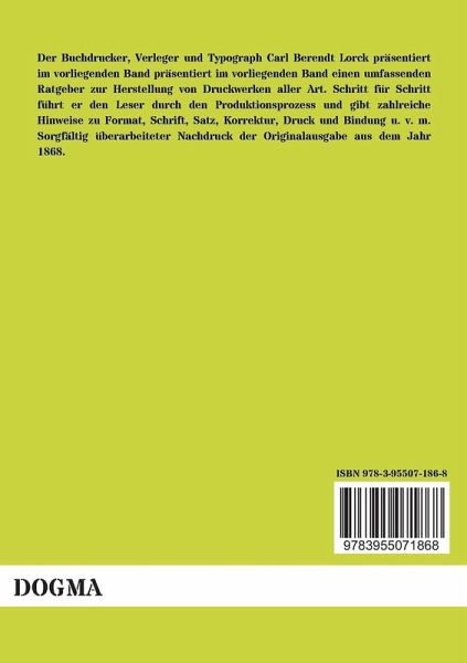 Der Buchdrucker, Verleger und Typograph Carl Berendt Lorck präsentiert im vorliegenden Band präsentiert im vorliegenden Band einen umfassenden Ratgeber zur Herstellung von Druckwerken aller Art. Schritt für Schritt führt er den Leser durch den Produktionsprozess und gibt zahlreiche Hinweise zu Format, Schrift, Satz, Korrektur, Druck und Bindung u. v. m. Sorgfältig überarbeiteter Nachdruck der Originalausgabe aus dem Jahr 1868.