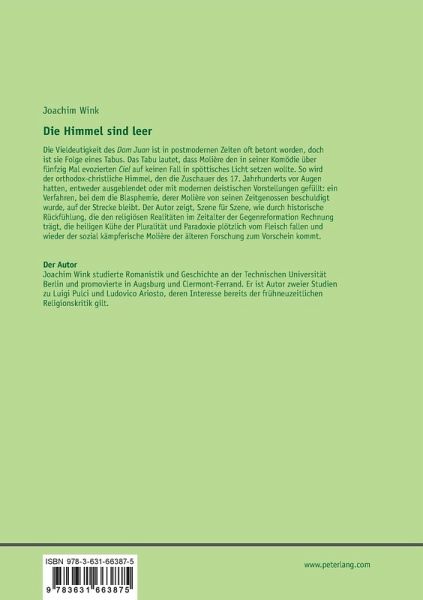 Die Vieldeutigkeit des Dom Juan ist in postmodernen Zeiten oft betont worden, doch ist sie Folge eines Tabus. Das Tabu lautet, dass Molière den in seiner Komödie über fünfzig Mal evozierten Ciel auf keinen Fall in spöttisches Licht setzen wollte. So wird der orthodox-christliche Himmel, den die Zuschauer des 17. Jahrhunderts vor Augen hatten, entweder ausgeblendet oder mit modernen deistischen Vorstellungen gefüllt: ein Verfahren, bei dem die Blasphemie, derer Molière von seinen Zeitgenossen beschuldigt wurde, auf der Strecke bleibt. Der Autor zeigt, Szene für Szene, wie durch historische Rückfühlung, die den religiösen Realitäten im Zeitalter der Gegenreformation Rechnung trägt, die heiligen Kühe der Pluralität und Paradoxie plötzlich vom Fleisch fallen und wieder der sozial kämpferische Molière der älteren Forschung zum Vorschein kommt.