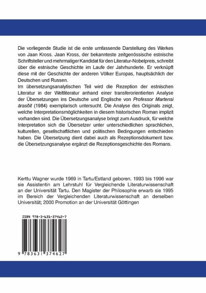 Professor Martensi ärasõit (1984) exemplarisch untersucht. Die Analyse des Originals zeigt, welche Interpretationsmöglichkeiten in diesem historischen Roman implizit vorhanden sind. Die Übersetzungsanalyse bringt zum Ausdruck, für welche Interpretation sich die Übersetzer unter unterschiedlichen sprachlichen, kulturellen, gesellschaftlichen und politischen Bedingungen entschieden haben. Die Übersetzung dient dabei auch als Rezeptionsdokument bzw. die Übersetzungsanalyse ergänzt die Rezeptionsgeschichte des Romans.