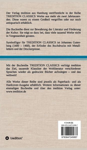 Diese Hardcover-Ausgabe ist Teil der TREDITION CLASSICS. Der Verlag tredition aus Hamburg veröffentlicht in der Buchreihe TREDITION CLASSICS Werke aus mehr als zwei Jahrtausenden. Diese waren zu einem Großteil vergriffen oder nur noch antiquarisch erhältlich. Mit TREDITION CLASSICS verfolgt tredition das Ziel, tausende Klassiker der Weltliteratur verschiedener Sprachen wieder als gedruckte Bücher zu verlegen und das weltweit! Die Buchreihe dient zur Bewahrung der Literatur und Förderung der Kultur. Sie trägt so dazu bei, dass viele tausend Werke nicht in Vergessenheit geraten.