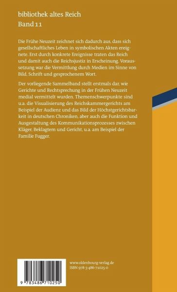 Die Frühe Neuzeit zeichnet sich dadurch aus, dass sich gesellschaftliches Leben in symbolischen Akten ereignete. Erst durch konkrete Ereignisse traten das Reich und damit auch die Reichsjustiz in Erscheinung. Voraussetzung war die Vermittlung durch Medien im Sinne von Bild, Schrift und gesprochenem Wort. Der vorliegende Sammelband stellt erstmals dar, wie Gericht- und Rechtsprechung in der Frühen Neuzeit medial vermittelt wurden. Themenschwerpunkte sind u.a. die Visualisierung des Reichskammergerichts am Beispiel der Audienz und das Bild der Höchstgerichtsbarkeit in deutschen Chroniken, aber auch die Funktion und Ausgestaltung des Kommunikationsprozesses zwischen Kläger, Beklagtem und Gericht, u. a. auch am Beispiel der Familie Fugger. Mit Beiträgen von: Matthias Bähr, Tobias Branz, Ignacio Czeguhn, Alexander Denzler, Andreas Deutsch, Thomas Dorfner, Maria von Loewenich, David Petry, Britta Schneider, Stefan Andreas Stodolkowitz, Steffen Wunderlich