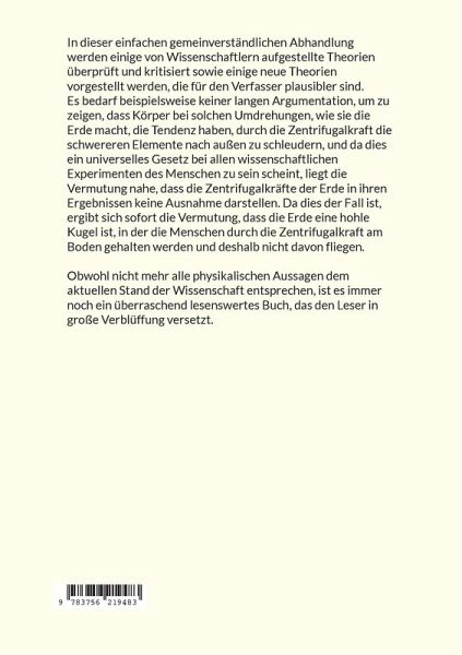 In dieser einfachen gemeinverständlichen Abhandlung werden einige von Wissenschaftlern aufgestellte Theorien überprüft und kritisiert sowie einige neue Theorien vorgestellt werden, die für den Verfasser plausibler sind.Es bedarf beispielsweise keiner langen Argumentation, um zu zeigen, dass Körper bei solchen Umdrehungen, wie sie die Erde macht, die Tendenz haben, durch die Zentrifugalkraft die schwereren Elemente nach außen zu schleudern, und da dies ein universelles Gesetz bei allen wissenschaftlichen Experimenten des Menschen zu sein scheint, liegt die Vermutung nahe, dass die Zentrifugalkräfte der Erde in ihren Ergebnissen keine Ausnahme darstellen. Da dies der Fall ist, ergibt sich sofort die Vermutung, dass die Erde eine hohle Kugel ist, in der die Menschen durch die Zentrifugalkraft am Boden gehalten werden und deshalb nicht davon fliegen.Obwohl nicht mehr alle physikalischen Aussagen dem aktuellen Stand der Wissenschaft entsprechen, ist es immer noch ein überraschend lesenswertes Buch, das den Leser in große Verblüffung versetzt.