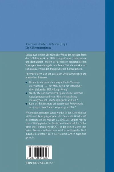 Einführung.- 1 Historie, Epidemiologie, Ätiologie.- 2 Morphologie, Pathomorphologie, Biomechanik, Klassifikation.- 3 Wachstum, Reifung und Dynamik im Säuglingshüftpfannendach - Experimentelle Untersuchungen an Wachstumsfugen.- Diagnostik.- 4 Klinische Untersuchung des Hüftgelenkes.- 5 Hüftsonographie.- 6 Sonographisches Hüftgelenk-Screening.- 7 Korrelation von anamnestischen Risikofaktoren und sonographischem Hüfttyp.- 8 Korrelation zwischen Sonographie- und Röntgenbefund.- 9 Pränatale sonographische Untersuchungen des Hüftgelenkes.- 10 3D-sonographische Darstellung der Säuglingshüfte.- 11 Röntgenuntersuchung und Arthrographie des Hüftgelenkes im Säuglings- und Kleinkindalter.- 12 Sonographische Beurteilung der knöchernen Femurkopfüberdachung nach dem 1. Lebensjahr.- 13 Einsatz der Computertomographie bei der Hüftreifungsstörung.- 14 Einsatz der Kernspintomographie bei der Hüftreifungsstörung.- 15 MRT-Diagnose der Labrumläsion und therapeutische Konsequenzen.- Therapie.- 16 Die Behandlung der Hüftdysplasie und Hüftluxation in den vergangenen 50 Jahren im Licht eigenen Erlebens.- Konservative Therapie.- 17 Therapieprinzipien in der Behandlung von Hüftreifungsstörungen.- 18 Sonographische Verlaufsuntersuchungen der Hüfttypen nach Graf unter Berücksichtigung therapeutischer Maßnahmen.- 19 Vergleichende Untersuchungen zur Wirksamkeit von Orthesen und Gipsverbänden bei Hüftdysplasie - Multicenterstudie des Arbeitskreises für Hüftdysplasie der DGOT.- 20 Maßnahmen zur Vermeidung einer Hüftkopfnekrose in der Behandlung von Hüftreifungsstörungen.- 21 Forensische Probleme bei der Behandlung von Hüftreifungsstörungen unter Berücksichtigung der "endogenen"Dysplasie.- Operative Therapie.- 22 Offene Repositionsverfahren im Säuglings-und Kleinkindalter.- 23 Langzeitergebnisse nach offenen Repositionsverfahren.- 24 Beckenosteotomien und operative Korrektur des proximalen Femurs im Kleinkind- und Vorschulalter.- 25 Hüftpfannenschwenkung durch Dreifachosteotomie des Beckens nach Tönnis.- Fazit der Herausgeber.