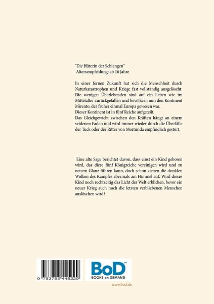 "Die Hüterin der Schlangen"Altersempfehlung: ab 16 JahreIn einer fernen Zukunft hat sich die Menschheit durch Naturkatastrophen und Kriege fast vollständig ausgelöscht. Die wenigen Überlebenden sind auf ein Leben wie im Mittelalter zurückgefallen und bevölkern nun den Kontinent Mirento, der früher einmal Europa gewesen war. Dieser Kontinent ist in fünf Reiche aufgeteilt. Das Gleichgewicht zwischen den Kräften hängt an einem seidenen Faden und wird immer wieder durch die Überfälle der Tuck oder der Ritter von Mortunda empfindlich gestört. Eine alte Sage berichtet davon, dass einst ein Kind geboren wird, das diese fünf Königreiche vereinigen wird und zu neuem Glanz führen kann, doch schon ziehen die dunklen Wolken des Kampfes abermals am Himmel auf. Wird dieses Kind noch rechtzeitig das Licht der Welt erblicken, bevor ein neuer Krieg auch noch die letzten verbliebenen Menschen auslöschen wird?
