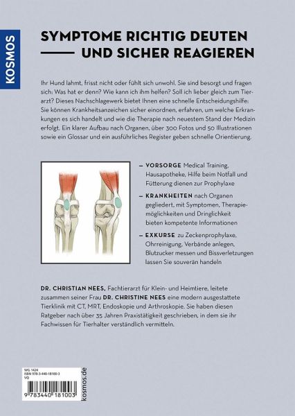 Die erfahrenen Tierärzte Drs. med. vet. Christian und Christine Nees beschreiben gängige Erkrankungen und wie deren Diagnostik und Behandlung nach dem heutigen Stand der Medizin aussehen. Dabei geben sie stets eine Entscheidungshilfe, wann man tiermedizinische Hilfe braucht, oder eine Anleitung, was man selbst machen kann. Fehlervermeidung hat einen großen Stellenwert in diesem Buch, es geht um Hilfestellung und Ratschläge aus ihrer langjährigen Praxiserfahrung. Ein Nachschlagewerk für alle Hundehalter, das Sicherheit und Kompetenz vermittelt. Zahlreiche Fotos und Illustrationen veranschaulichen die Krankheitsbilder und dienen der Erläuterung.