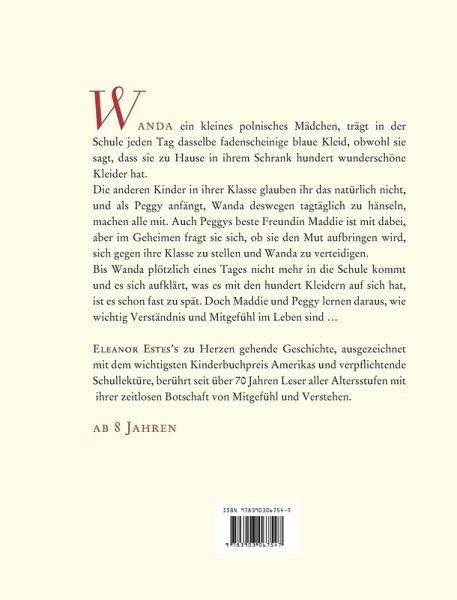 Wanda, ein kleines polnisches Mädchen, trägt in der Schule jeden Tag dasselbe fadenscheinige blaue Kleid, obwohl sie sagt, dass sie zu Hause in ihrem Schrank hundert wunderschöne Kleider hat.Die anderen Kinder in ihrer Klasse glauben ihr das natürlich nicht, und als Peggy anfängt, Wanda deswegen tagtäglich zu hänseln, machen alle mit. Auch Peggys beste Freundin Maddie ist mit dabei, aber im Geheimen fragt sie sich, ob sie den Mut aufbringen wird, sich gegen ihre Klasse zu stellen und Wanda zu verteidigen.Bis Wanda plötzlich eines Tages nicht mehr in die Schule kommt und es sich aufklärt, was es mit den hundert Kleidern auf sich hat, ist es schon fast zu spät. Doch Maddie und Peggy lernen daraus, wie wichtig Verständnis und Mitgefühl im Leben sind ...Eleanor Estes zu Herzen gehende Geschichte, ausgezeichnet mit dem wichtigsten Kinderbuchpreis Amerikas und verpflichtende Schullektüre, berührt seit über 70 Jahren Leser aller Altersstufen mit ihrer zeitlosen Botschaft von Mitgefühl und Verstehen.