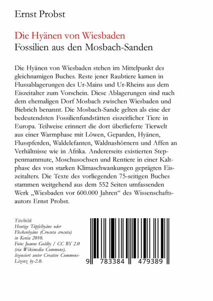 Die Hyänen von Wiesbaden stehen im Mittelpunkt des gleichnamigen Buches. Reste jener Raubtiere kamen in Flussablagerungen des Ur-Mains und Ur-Rheins aus dem Eiszeitalter zum Vorschein. Diese Ablagerungen sind nach dem ehemaligen Dorf Mosbach zwischen Wiesbaden und Biebrich benannt. Die Mosbach-Sande gelten als eine der bedeutendsten Fossilienfundstätten eiszeitlicher Tiere in Europa. Teilweise erinnert die dort überlieferte Tierwelt aus einer Warmphase mit Löwen, Geparden, Hyänen, Flusspferden, Waldelefanten, Waldnashörnern und Affen an Verhältnisse wie in Afrika. Andererseits existierten Steppenmammute, Moschusochsen und Rentiere in einer Kaltphase des von starken Klimaschwankungen geprägten Eiszeitalters. Die Texte des vorliegenden 75-seitigen Buches stammen weitgehend aus dem 552 Seiten umfassenden Werk "Wiesbaden vor 600.000 Jahren" des Wissenschaftsautors Ernst Probst.