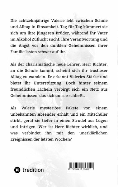 Die achtzehnjährige Valerie lebt zwischen Schule und Alltag in Einsamkeit. Tag für Tag kümmert sie sich um ihre jüngeren Brüder, während ihr Vater im Alkohol Zuflucht sucht. Ihre Verantwortung und die Angst vor den dunklen Geheimnissen ihrer Familie lasten schwer auf ihr.Als der charismatische neue Lehrer, Herr Richter, an die Schule kommt, scheint sich ihr trostloser Alltag zu wandeln. Er erkennt Valeries Stärke und bietet ihr Unterstützung. Doch hinter seinem freundlichen Lächeln verbirgt sich ein Netz aus Geheimnissen, das sich um sie schließt.Als Valerie mysteriöse Pakete von einem unbekannten Absender erhält und ein Mitschüler stirbt, gerät sie tiefer in einen Strudel aus Lügen und Intrigen. Wer ist Herr Richter wirklich, und was verbindet ihn mit den unerklärlichen Ereignissen der letzten Wochen?
